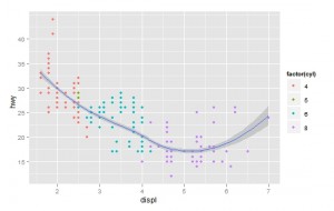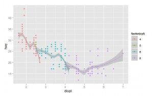 library(ggplot2)p <- ggplot(data=mpg,aes(x=displ,y=hwy,colour=factor(cyl)))p + geom_point() + geom_smooth()