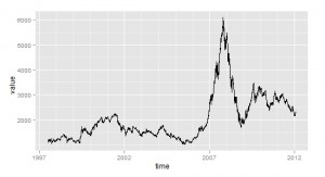 library(quantmod)library(ggplot2)getSymbols('^SSEC',src='yahoo',from = '1997-01-01')close <- (Cl(SSEC))time <- index(close)value <- as.vector(close)p <- ggplot(data.frame(time,value),aes(time,value))p + geom_line()