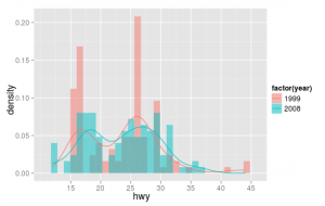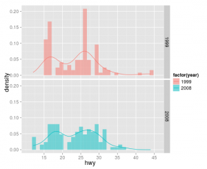 p <- ggplot(mpg,aes(hwy))p + geom_histogram(position = 'identity',alpha=0.5,aes(y = ..density..,fill = factor(year)))+stat_density(geom = 'line',position = 'identity',aes(colour = factor(year)))