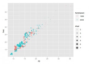 p1 <- p + geom_point(aes(colour = factor(year),shape = factor(year), size = displ), alpha = 0.6, position = 'jitter')