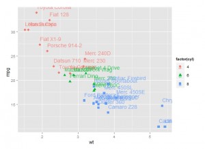 p <- ggplot(mtcars, aes(x=wt, y=mpg,colour=factor(cyl),label=rownames(mtcars)))p + geom_text(hjust=0,vjust=-1,alpha=0.8)+ geom_point(size=3,aes(shape=factor(cyl)))