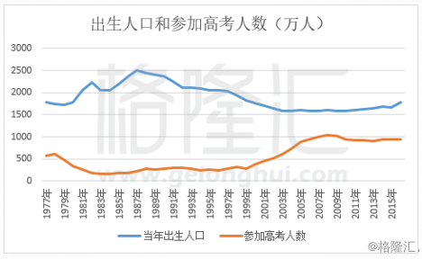 下图是出生人口和高考人数,先看看出生人口的变化,我们可以观察到1987 年前后出现了一个生育高峰,主要原因一个是1960年代也存在一个生育高峰,这些人到80年代正是婚育年龄,且改革开放后经济开始腾飞,形成出生人口高峰,可以看到人口周期约25年。