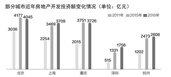 《每日经济新闻》记者梳理发现,在国家统计局公布的35个主要城市中,2011年,北京、上海和重庆房地产开发投资额占据着前三位;到了2015年和2016年,北京、重庆、上海房地产开发投资额同样位列前三位。