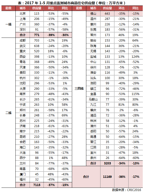 从具体数据来看,今年前5月重点城市新建商品住宅新增供应面积11169万平方米,同、环比分别减少17%和36%。