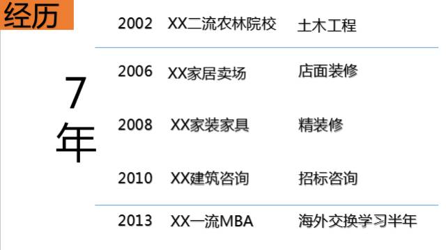 这个简历拿出来确实不好看,7年的时间啊,基本上人生10%的时间都放在了建筑行业,而且还是不入流的边缘行业。MD,太丢脸了。你说要是进个设计院、房地产、园区开发公司也可以啊,什么家居卖场的装修?家庭装修?你逗我呢吧?你不就是个装修的么?