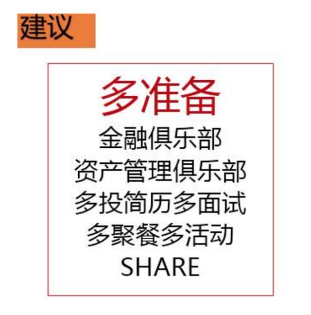 金融行业有share的精神,但是也需要你主动去认识朋友。通过各种途径吧,像金融俱乐部、资产管理俱乐部、导师学习计划、公共关系委员、各种机构实习机会,一直牢牢关注着,一有机会就傻呵呵地去混个脸熟,也不管自己能不能hold住。事实证明,这样是及其傻逼的,没有目的的社交基本就是无效社交,但是上天还是爱勤奋的人啊,100个机会中总有1、2个,这也为后期去实习奠定了人脉基础。