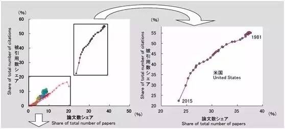 从1981年—2015年,美国,日本,欧洲国家的基础科研成果世界份额都在下滑,而中国处于飙升,论文被引用次数从1981年占世界比例不到1%,上升到2015年的占世界13.5%,在全球范围内仅次于美国。