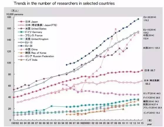 日本文部科学省官方每年都会对世界各国科技实力产出进行数据统计,以下的内容全部来自日本文部科学省2016年版报告,这个报告很长,