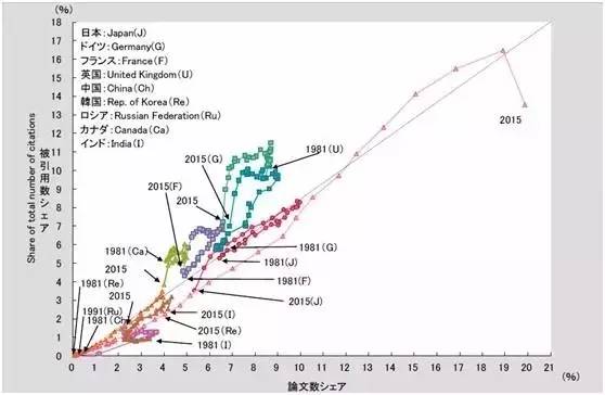 1981年,世界基础科学研究第二强国是英国,论文被引用次数占了全球10%左右,德国世界第三,被引用次数占全球大约6%,日本世界第四,占世界大约5%。