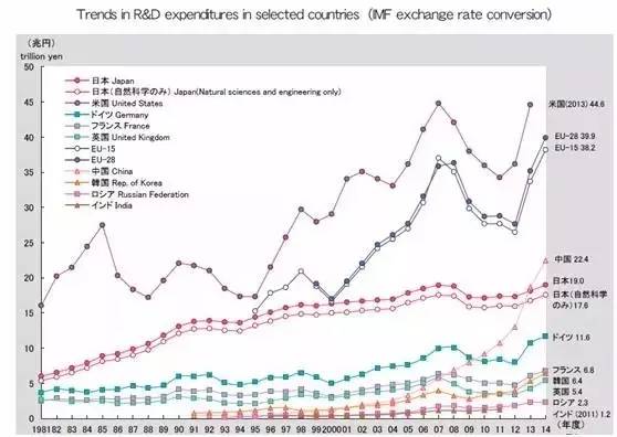 首先看下图是世界各国投入到RD研发的经费支出,按照日本人的统计,中国的科技研发支出在2013年和日本进行了一个交叉,在2013年研发支出超过了日本,2014年更是超过日本17.9%,达到22.4万亿日元。实际上,今天中国的研发支出已经是日本的两倍了。