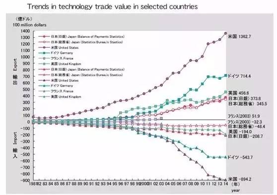 下面这张图,日本每年技术贸易是顺差,顺差的金额仅次于美国位居世界第二。这张图经常在网络上经常被作为日本科技多么发达的证据。
