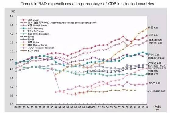 中国2014年RD研发投入占GDP比例为2.05%,和欧盟28国平均的2.08%差不多,超过了英国的1.72%。日本是3.87%,日本在世界主要国家中仅次于韩国的4.29%