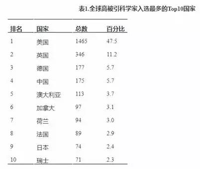 如果我们再进一步,比较世界各国被引用次数排在全球前1%的论文数量比较,中国也是世界第二。