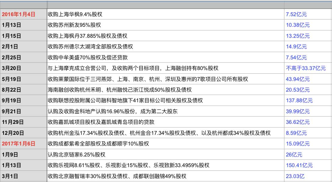每经小编(微信号:nbdnews)在融创中国2016年财报中发现,从去年到今年3月,融创完成了16笔并购,斥资约589亿元。