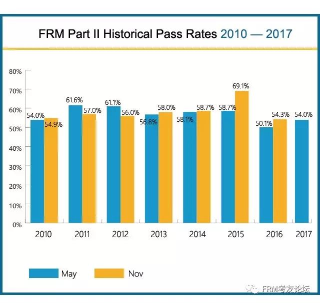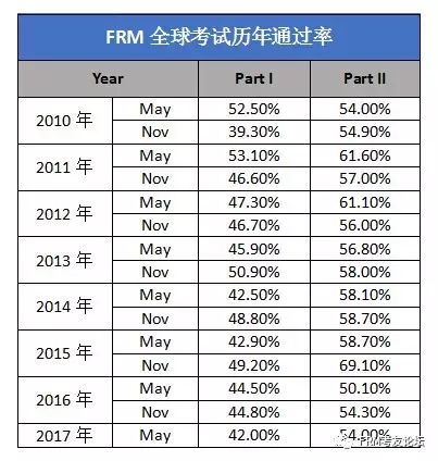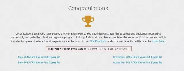 GARP官网公布:2017年5月FRM考试的通过率官网已给出! May 2017 Exams Pass Rates: FRM Part I: 42% | FRM Part II: 54% 。相比2016年11月来看通过率下降了,可能是11月通过率较高,5月难度有所加大