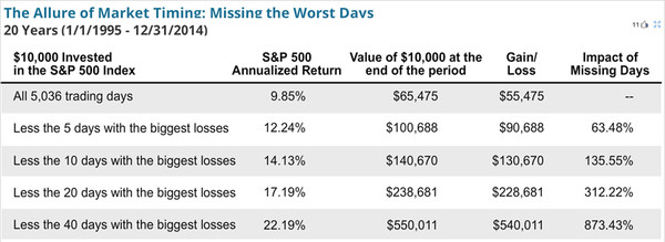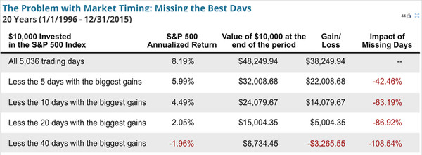 同样以过去20年的标准普尔指数500(美国股市)为例(截至2015年12月31日)。这20年Buy and Hold的投资回报为每年8%左右。但是如果投资者由于各种原因在股市上涨最大的5天没有持有股票,那么其回报就会下跌到每年5.99%,和原来的Buy and Hold相比整整差了42%。如果投资者错过了股市上涨最大的10天,那么其回报会进一步下跌到每年4.49%左右,和原来Buy and Hold的回报相比整整差了63%。 换句话说,如果投资(投机)者搞错了5,000多天中的5天(0.1%),在那上涨最大的5天阴差阳错没有持有股票,那么他即使坚持投资(投机)20年,也很难把那5天的损失补回来。