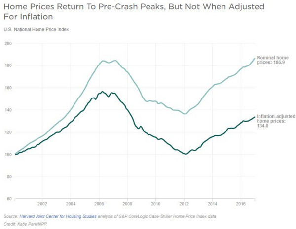 不过,如果扣除物价通胀因素,房价的整体情况会有所不同:经过通胀调整后,房价比危机前的高峰期低了近20%。