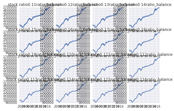 我们分析按照股票资产涨跌5%的时候重新进行再平衡,分析资产配置比率的影响: