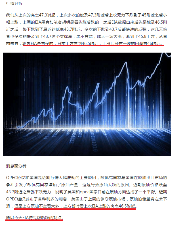 原油现在徘徊在45.3附近,笔者今晚下方看45.1附近。今天的EIA是和上周是一样的走势,最近没有太多确切的消息面数据去支撑原油上涨,欧佩克组织的协议也只是空头承诺,没有具体措施,所以今天的下跌是必然的。今天多单在手的可以在45.8附近选择出局同时空单也可以在这附近进场。具体详情可以带上截图找黑金胡明。