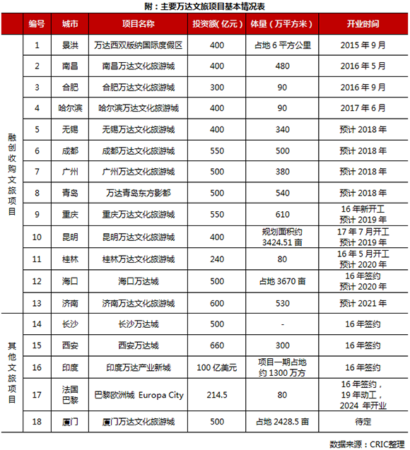 根据万达集团工作简报,万达集团17年上半年收入1348.5亿元,其中万达商业的租金收入为116.9亿元。而这部分租金收入还包括万达广场的收入,也就是说其中万达文旅城项目所贡献的租金更少。根据CRIC来看,截止到目前,万达已经投入运营的文旅项目有万达西双版纳国际度假区、南昌万达文化旅游城、合肥万达文化旅游城、哈尔滨万达文化旅游城等4个项目,相对于每个项目投资资金达400-500亿的规模来说,这样的投资收益优势并不突出。