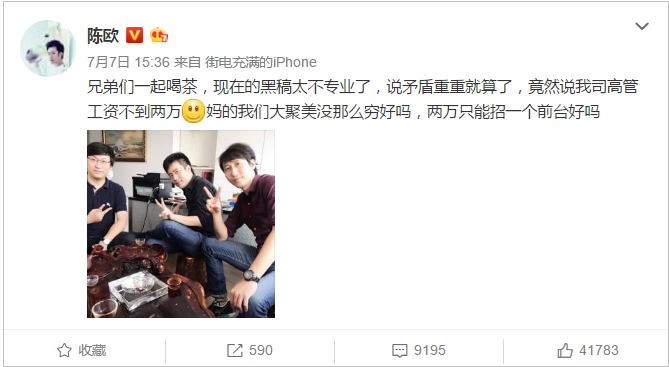 现在,拥有高达 4500 万微博粉丝,被网友戏称为最前排吃瓜群众的陈欧,绝对可以称得上企业家里面的头号网红。而陈欧本人似乎也很享受这种身份,微博上卖货成了其最常用的促销手段,尽管陈欧的微博下面依旧能看到有用户抱怨在聚美买到假货……