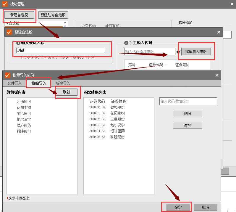 2.快捷键F7,新建自选股,设置好板块名称后,点下批量导入成分-粘贴导入(文件导入),然后点确定即可