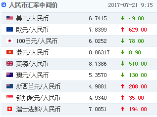 新浪财经讯 7月21日,人民币(6.7662, 0.0093, 0.14%)兑美元中间价报6.7415,较上日中间价升值49个基点,创2016月10月20日以来最强。