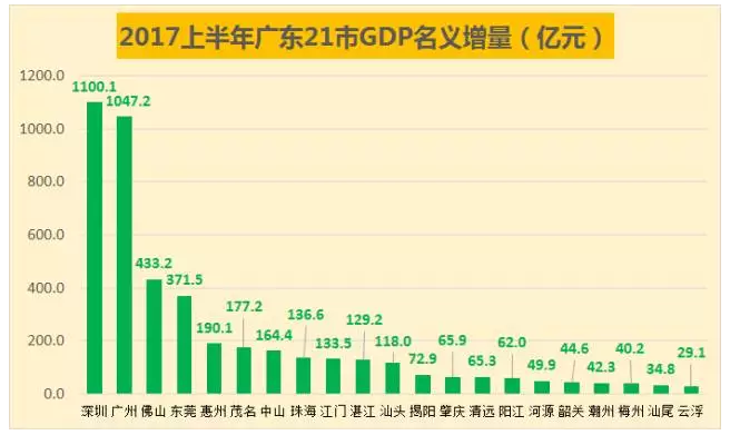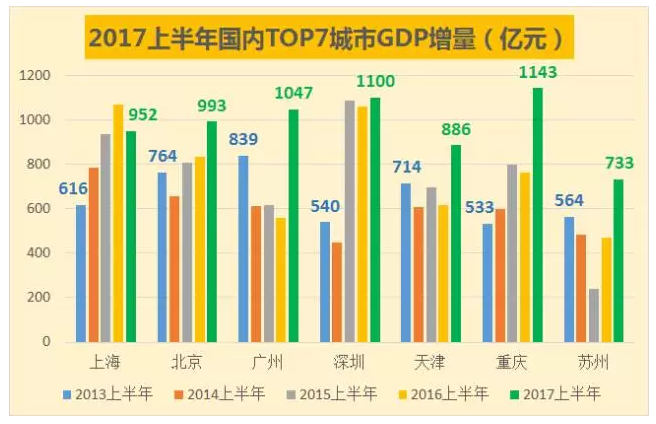 数据显示,广深上半年的GDP增量分别达到1100亿元和1047亿元,超过北京、上海的993亿元、952亿元。考虑到广深下半年数据往往比上半年更好,所以2017年全年数据,广深亦有望超越北上。