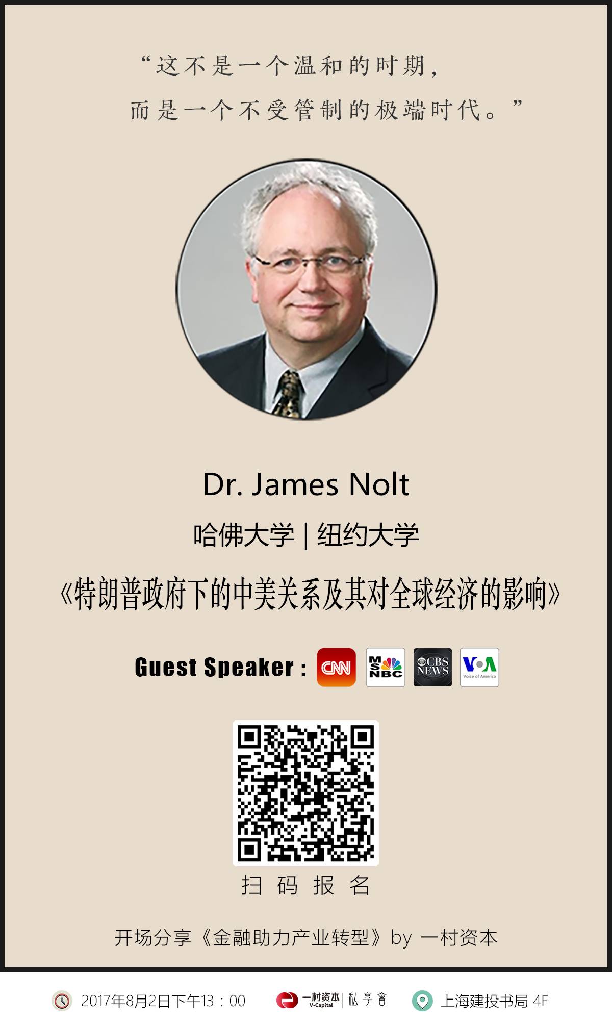 活动主题:《特朗普政府下的中美关系及其对全球经济的影响》 演讲嘉宾:Dr. James Nolt 时间:2017年8月2日(星期三) 地点:中国 上海 建投书局 主办:一村资本 私享会