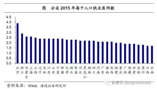 优质医疗资源向一线城市集聚,是否本身就与人口集聚有关?未必如此,比较各省人均医疗资源(每千人口执业医师数量),其分布同样是向东部尤其是一线城市倾斜。北京每千人口执业医师数接近4,浙江接近3,而中西部地区普遍在2左右甚至更低。