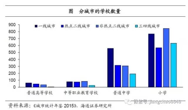 教育资源在城市间的分布并不均衡,特别值得注意的是,在更高级别的教育资源上,一线城市的资源集中优势更为突出。在小学数量上,一线城市平均有767所,而三四线城市平均有633所,两者数量大体相当。但在更高层次的普通中学、中等职业教育学校数量上,一二线城市均数倍于三四线城市。而在普通高等学校数量上,一线城市平均拥有62所,而三四线城市平均只有4所,不到前者的1/10。高等级教育资源向一线城市集中可见一斑。