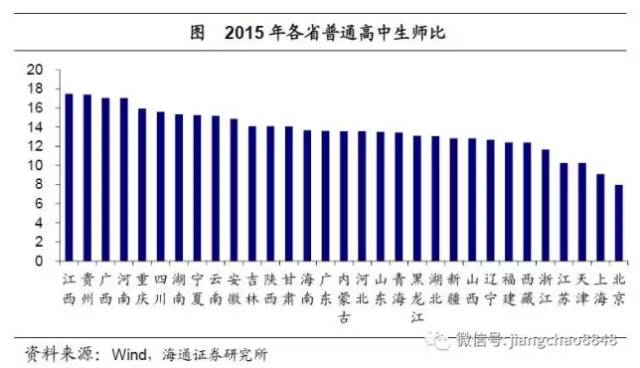 一二线城市学校数量远高于三四线城市,一定程度上与两者本身的人口规模差异有关。两者人均教育资源差距有多大?即便从省级数据看,教育资源的分配也是极其不均衡的。北京、上海普通高中生师比分别为8和9,一二线城市集聚的江浙地区,生师比也仅在10左右。但中西部地区各省生师比普遍高企,江西高达17.5,是北京、上海的两倍,这意味着其人均教育资源仅有北京、上海的一半。