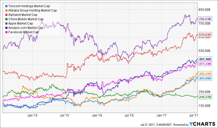相比起平稳的中国移动这类国企,阿里和腾讯的市值变化,也反映出了互联网行业的兴起和活力。下图结合了国外主要科技公司的市值走势,可以看出,阿里和腾讯与亚马逊和Facebook虽然仍有差距,但也在慢慢靠近。而谷歌和苹果两个科技巨头市值之高,让其他公司难以望其项背。市值的走势,也反映出了科技行业中各家公司的真实地位。