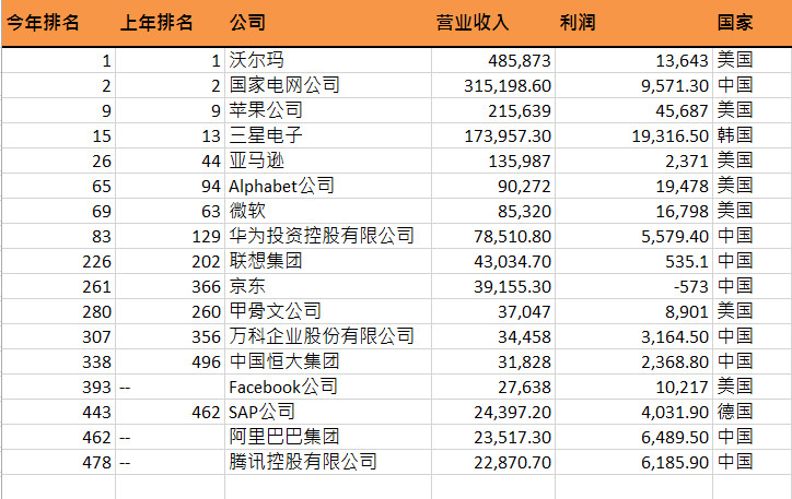 国外的公司中,沃尔玛连续四年位于榜首,苹果公司蝉联第9,其竞争对手三星位于第13位,亚马逊、谷歌母公司Alphabet、微软各为第26、65、69位。今年首次上榜的Facebook位于第393位。在过去的一年中,阿里和腾讯营收表现优异,进入世界500强是板上钉钉的事。随着阿里和腾讯的入围,世界五百强中共有六家互联网公司,中国和美国各占一半(美国的三家为亚马逊、谷歌母公司Alphabet、Facebook)。