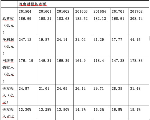 与风头正盛的京东、市值不断冲破纪录的阿里、腾讯相比,过去一年,百度经历了百度贴吧、“魏则西”等风波,两名副总裁王湛、李明远也相继离职,还出现了连续两个季度的净利下滑。而上一次,百度实现营收、净利均同比上涨,还要追溯至2015年。