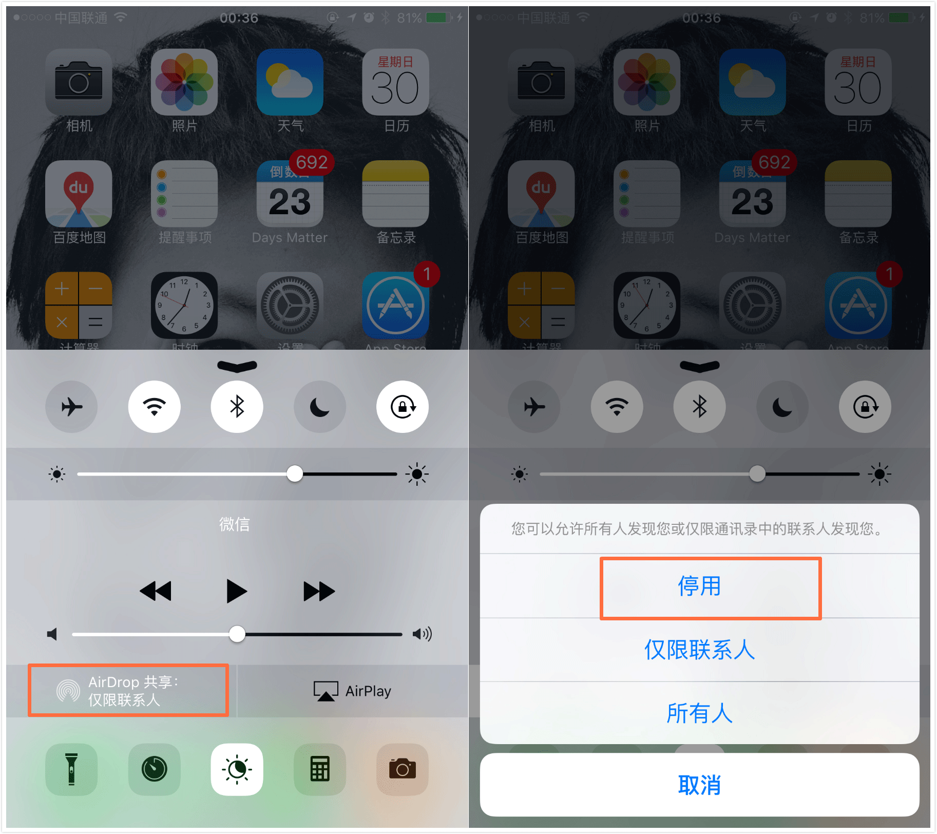 【从下向上滑动,打开“控制中心”界面】-【点击“AirDrop共享”】-【选择“停用”即可】