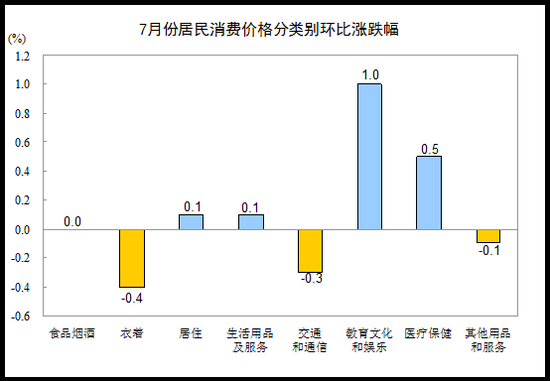 7月份,其他七大类价格环比四涨三降。其中,教育文化和娱乐、医疗保健价格分别上涨1.0%和0.5%,居住、生活用品及服务价格均上涨0.1%;衣着、交通和通信、其他用品和服务价格分别下降0.4%、0.3%和0.1%。