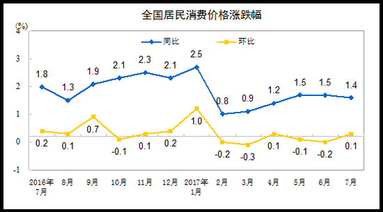 2017年7月份,全国居民消费价格同比上涨1.4%。其中,城市上涨1.5%,农村上涨1.0%;食品价格下降1.1%,非食品价格上涨2.0%;消费品价格上涨0.5%,服务价格上涨2.9%。1-7月平均,全国居民消费价格总水平比去年同期上涨1.4%。