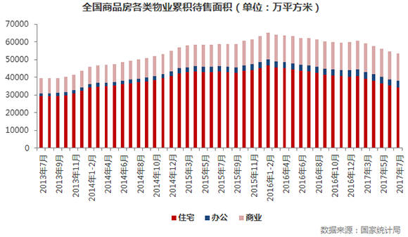 7月末,商品房待售面积63496万平方米,比6月末减少1081万平方米。其中,住宅待售面积减少988万平方米,办公楼待售面积增加1万平方米,商业营业用房待售面积减少64万平方米。
