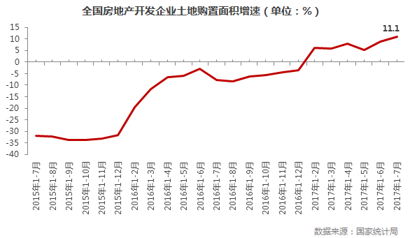 1-7月份,房地产开发企业土地购置面积12410万平方米,同比增长11.1%,增速比1-6月份提高2.3个百分点;土地成交价款5428亿元,增长41.0%,增速提高2.5个百分点。