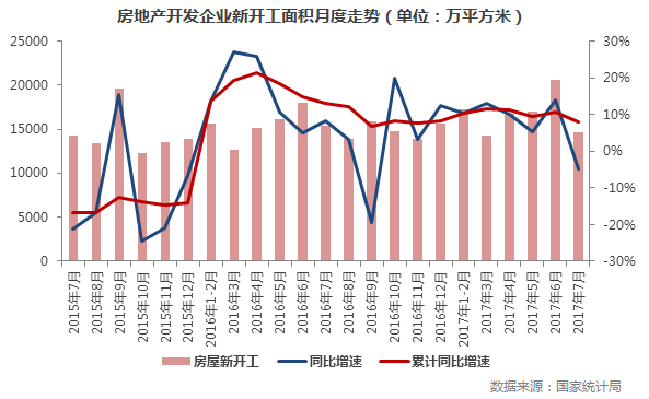 1-7月房屋新开工面积100371万平方米,增长8.0%,增速回落2.6个百分点。其中,住宅新开工面积71746万平方米,增长11.9%。