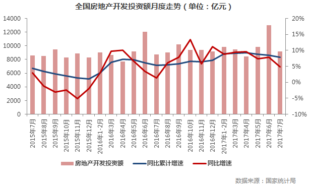 2017年1-7月份,全国房地产开发投资59761亿元,同比名义增长7.9%,增速比1-6月份回落0.6个百分点。其中,住宅投资40683亿元,增长10.0%,增速回落0.2个百分点。住宅投资占房地产开发投资的比重为68.1%。