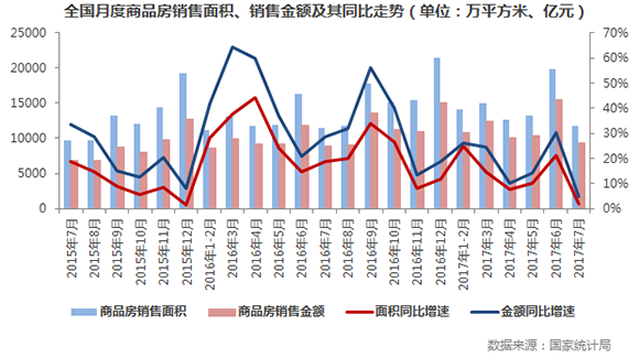 整体而言,7月销售指标迅速下滑延续着3月份高点之后4、5月份以来市场调整格局,确立了当前市场处在下行调整走势。政策上,随着愈来愈多的三四线城市和此前去库存的城市加入调控行列,商品房销售面积将继续下滑,三季度末同比增速或将降至10%调以下。