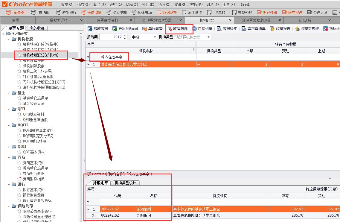 2. 选择机构持股汇总(按机构)专题,点击数据筛选,输入关键词“养老保险基金”,下表会展示持股明细