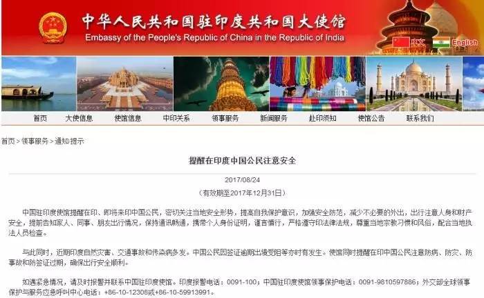 8月24日,中国驻印度大使馆网站发布消息,提醒在印度中国公民注意安全。这是自6月18日印度非法侵入中方领土以来,中国驻印度使馆在不到两个月的时间里第二次发布相关提醒信息,上一次发布是在7月7日。