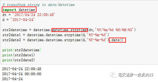 第二个红框表示使用datetime模块下的子模块datetime函数strptime完成字符串到日期时间型的转换,但奇怪的是,原始数据为日期型的字符串,但转换后成了日期时间型,单后面多了表示时间的部分00:00:00;