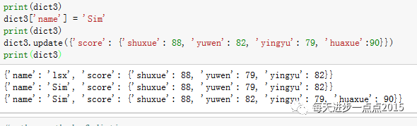 字典中更新键对应的值,既可以使用索引的方式,也可以使用update方法,但update方法中的参数一定是一个字典。如果该字典的键在dict3中存在,则操作改的动作,否则完成增加键值对的使命。