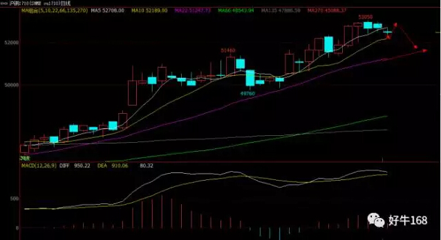 从日线级别来看,豆粕价格昨日进一步下行,最大的反抽力度并未将五日均线击穿,那么空头力量就较强,而日线的MACD指标当中动能绿柱开始二次放量了,若是今日价格的最大反抽依旧未去触及5日均线的话,后期有望走出进一步的下跌。所以今日建议以逢高做空为主,日内建议2720布局空单,止损2730,止盈2680;2680布局多单,止损2670,止盈2710。