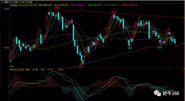从三十分钟级别图来看,螺纹价格上下方的空间进一步被压缩,螺纹在昨日试探过了22日均线,晚间价格整体运行在22日线以下,三十分钟级别的走势空头力量较强,笔者在昨日也有提到需要注意此点位有击穿的可能,那么价格极有可能转而为空了,今日建议以逢高做空为主。日内建议:3880附近可以选择布局一次空单,止损3900,止盈3820;可选择在3810附近布局多单,止损3790,止盈3870附近。