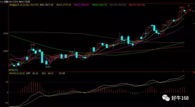 从日线图来看,甲醇均线系统已经呈现多头排列,价格依托五日均线进一步上行,但是价格与均线的乖离较大,短期价格面临部分的调整之后再进一步上行,而价格所选择方式是在高位盘整,证实空头力量较为薄弱,日内所需重点关注的点位在五日均线附近。所以日内当价格给到部分的回撤之后即可布局多单。日内建议:2830附近布局多单,止损2810,止盈2860附近;2870附近布局空单,止损2880,止盈2820附近。